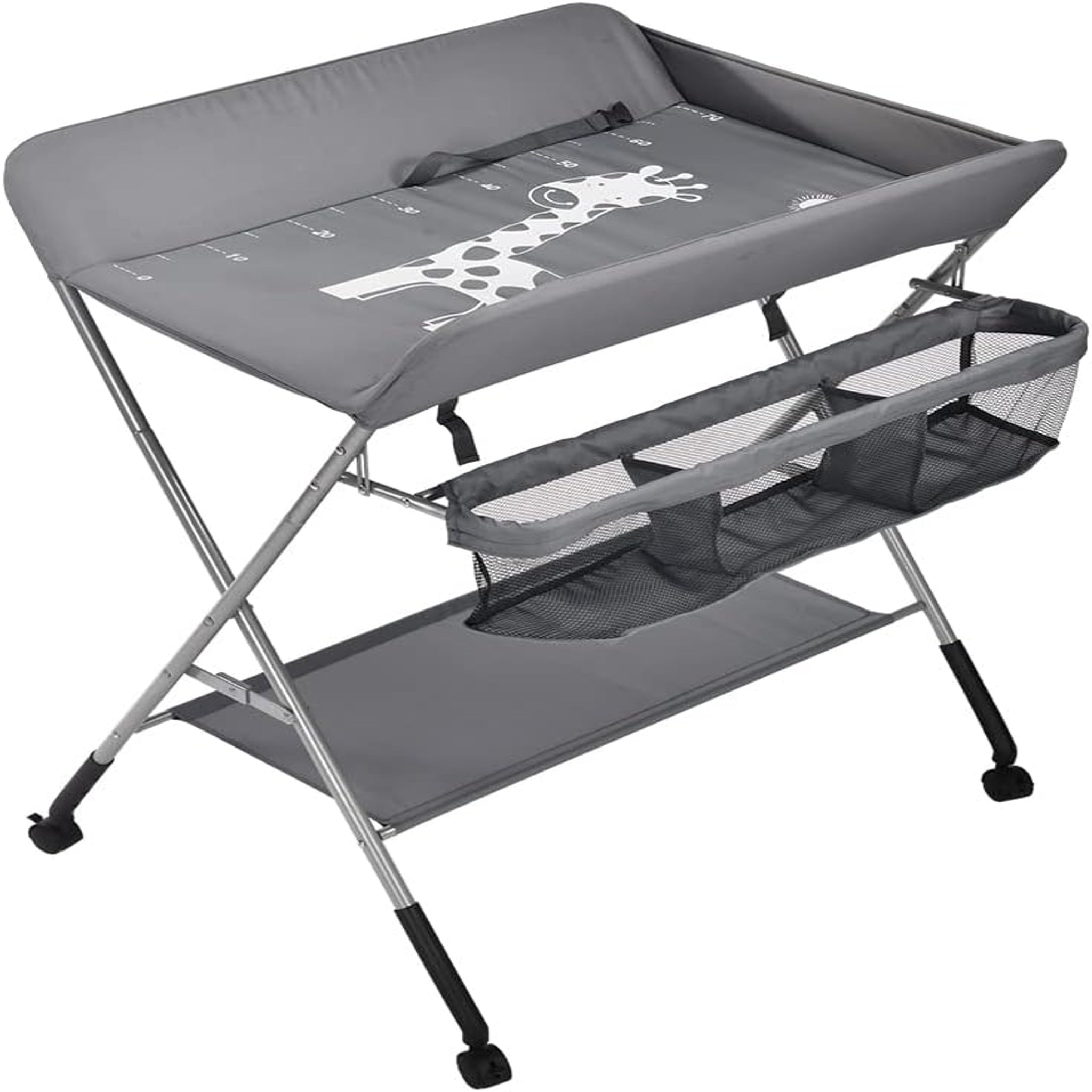 السطح مصنوع من قماش سهل التنظيف مزين بطبعة زرافة مرحة مع علامات قياس، مما يسمح للوالدين بمتابعة نمو طفلهم. كما يتضمن حزام أمان محكم لتثبيت الطفل أثناء الاستخدام، ورفًا سفليًا لتخزين المستلزمات الأساسية مثل الحفاضات والمناديل المبللة والكريمات.